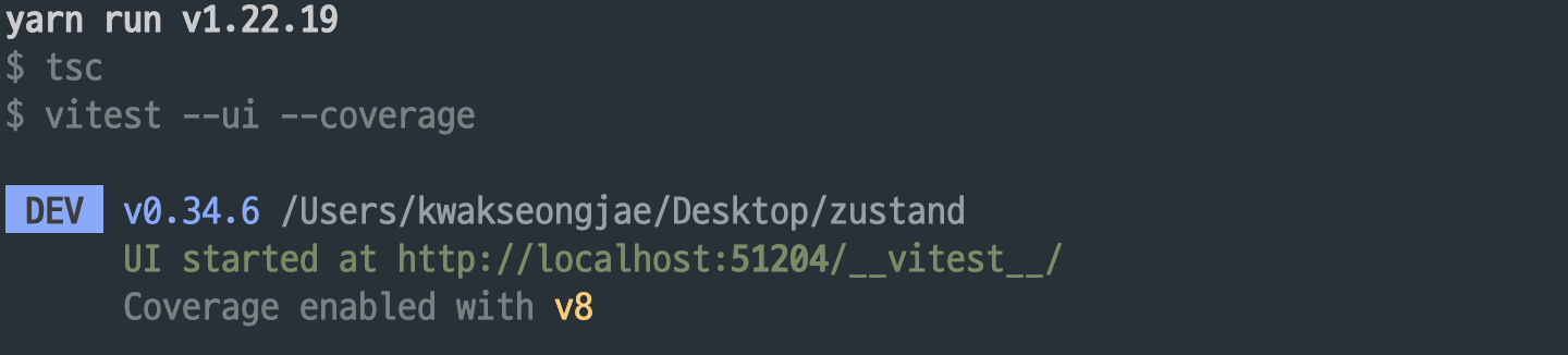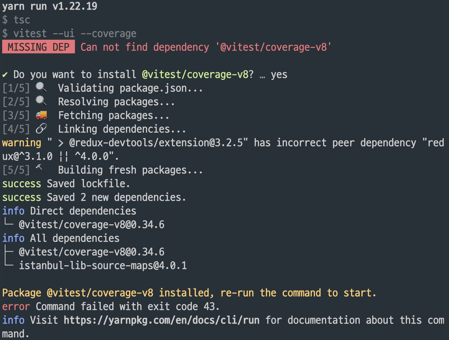 @vitest/coverage-v8을 설치하라는 문구가 올라와 추가로 설치해줬습니다. yarn 명령어로 의존성을 설치했을 땐 왜 설치가 안되었는지는 의문이지만 일단 잘 설치된 거 같네요.