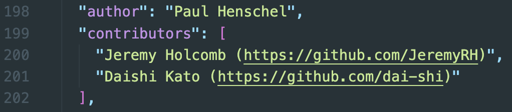 오픈소스의 pakage.json에는 저자와 컨트리뷰터(아마 메인테이너인거 같습니다)의 이름도 적어주는 거 같습니다.