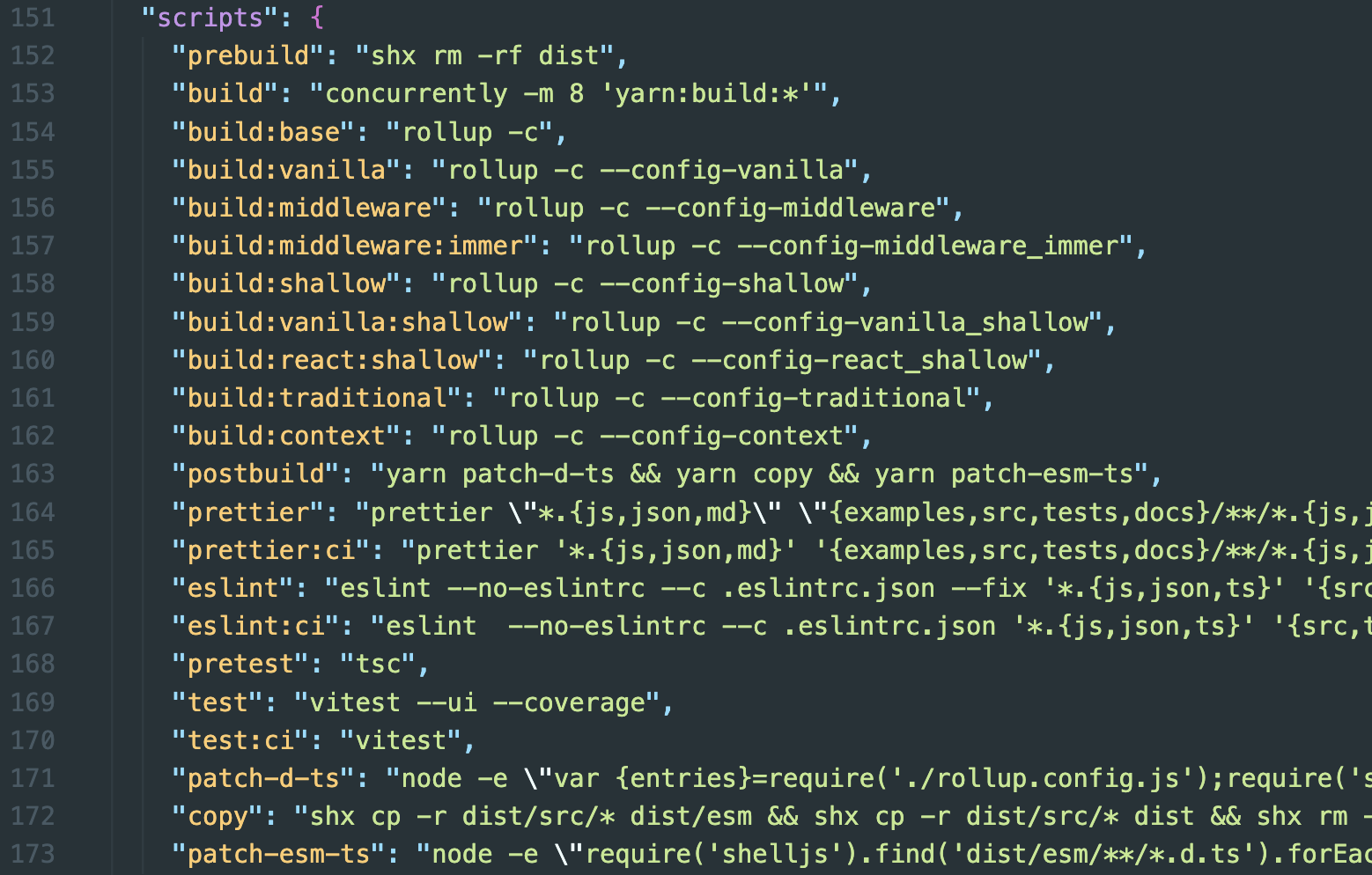 Zustand에선 어떤 커맨드로 작업을 진행하는지 궁금해서 scripts를 확인해봤습니다. 여기서도 살짝 벽이 느껴지는 느낌이 드네요.. 처음부터 다 기억하는 건 욕심이라 생각해서 딱 두가지만 알아두고 넘어갔습니다.