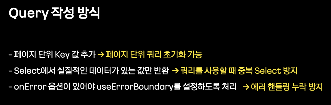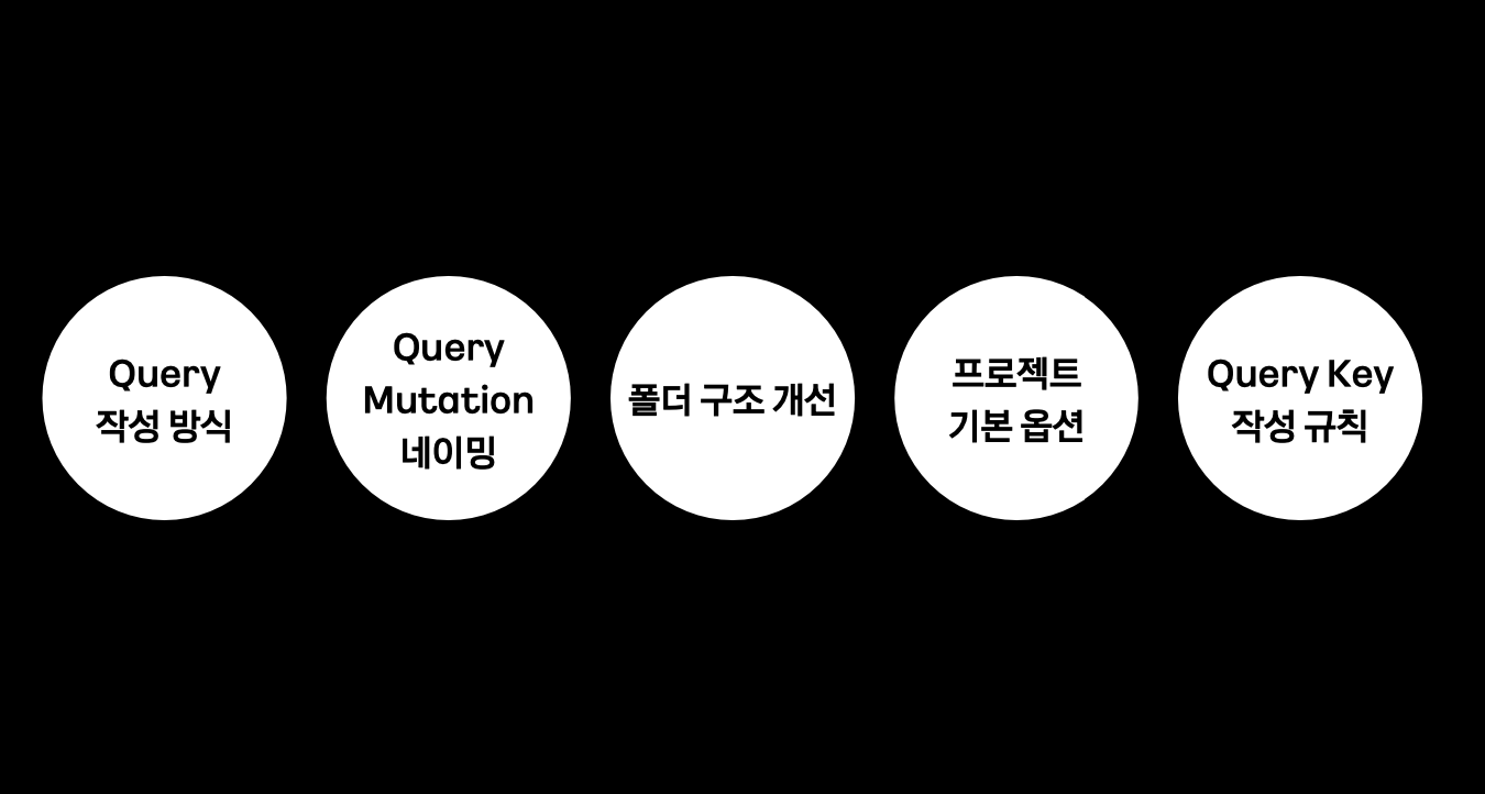 React-Query로 전환 과정에서 My 구독팀은 아래 사항들에 대한 규칙을 세우기 위한 내부적인 노력이 있었습니다. 컨퍼런스 발표에선 시간 여건상 이 중 ‘Query 작성 방식’과 ‘폴더 구조 개선’을 중심적으로 다뤘습니다.