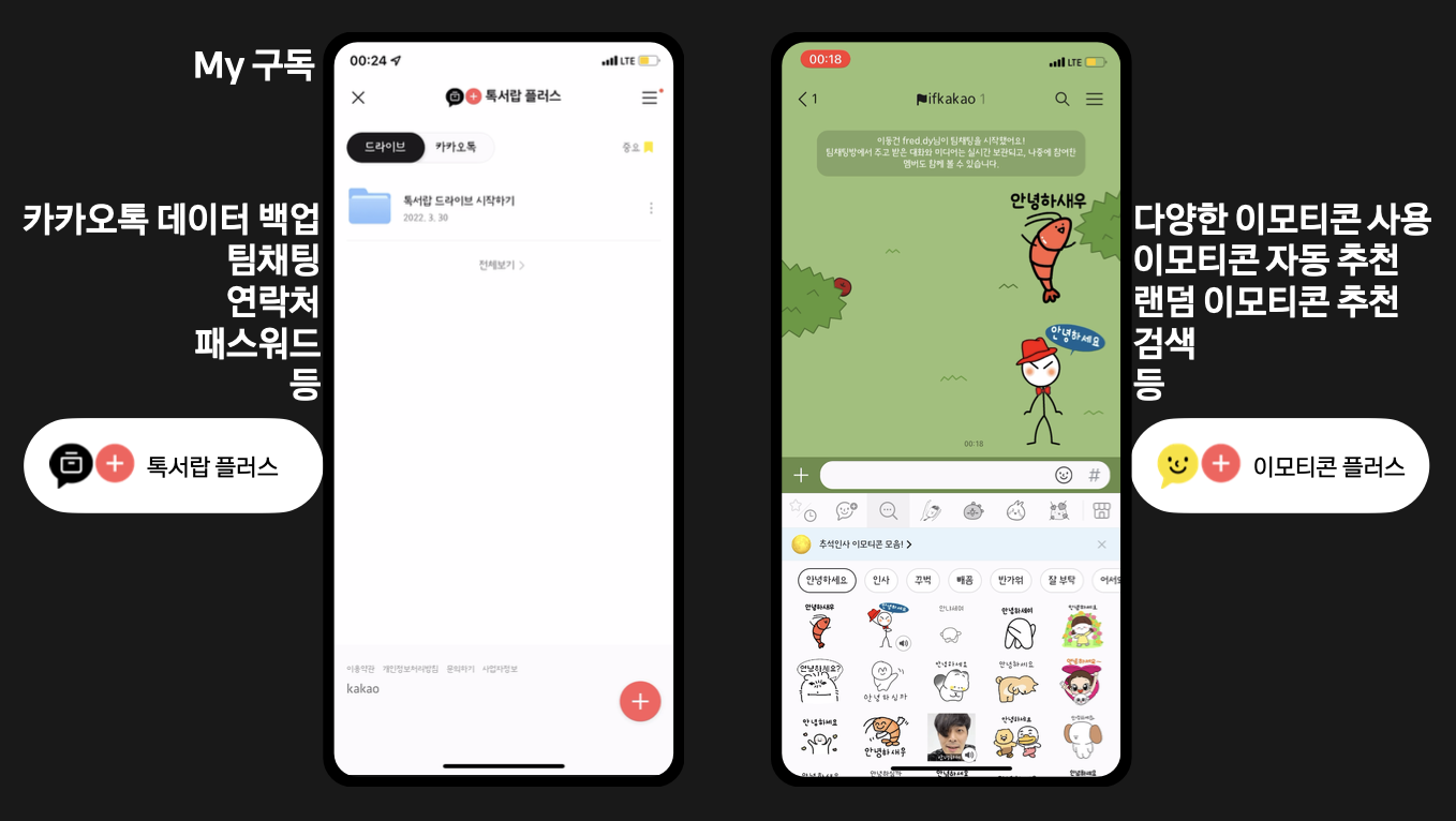 My구독팀에선 담당하고 있는 기능을 정리하면 ‘톡서랍 플러스’와 ‘이모티콘 플러스’기능으로 나눌 수 있습니다.