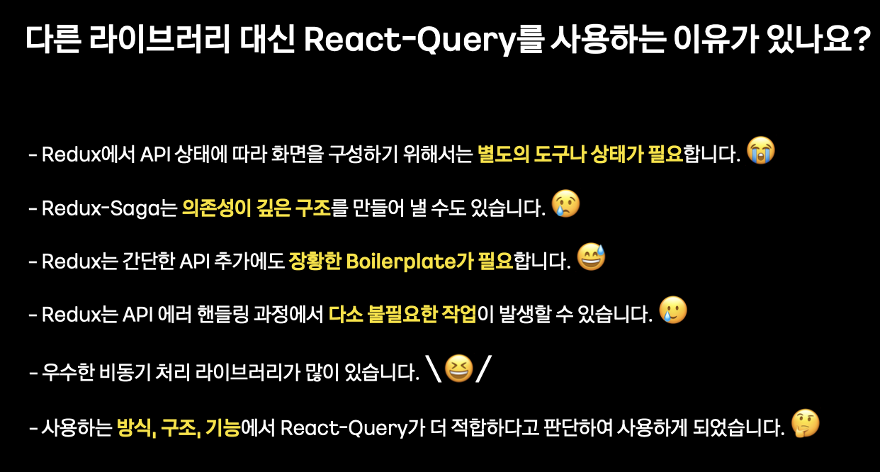 다른 라이브러리 대신 React-Query를 사용하는 이유를 정리하면 다음과 같습니다.