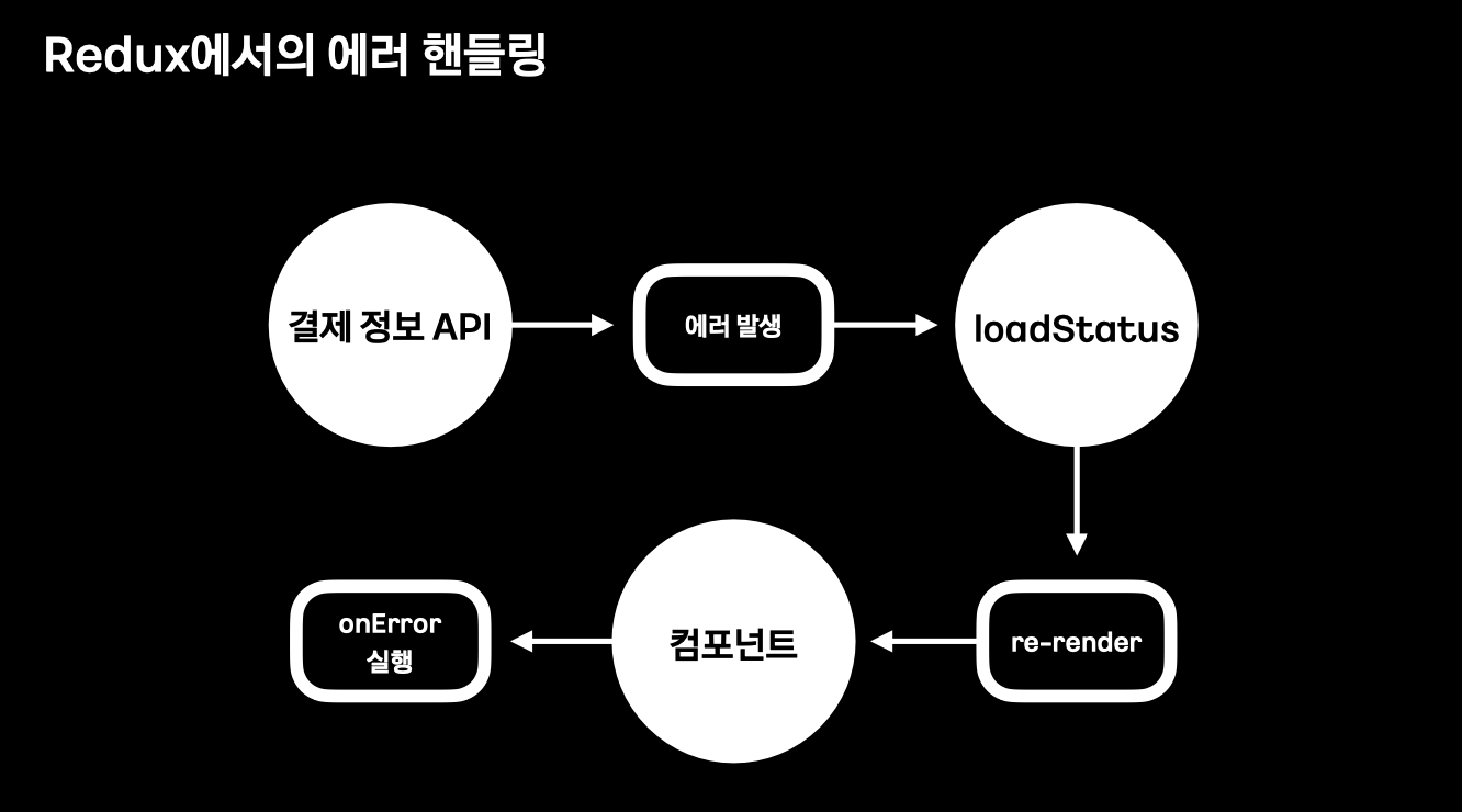 Redux에서의 에러 핸들링은 loadStatus 상태를 활용하여 진행됩니다. API 사용 중 에러가 발생하면 loadStatus 상태를 변경시켜 리렌더링을 발생시킵니다. 리렌더링을 통해 컴포넌트를 변화시키고 이를 통해 onError를 실행시키는 구조를 채택하고 있습니다.