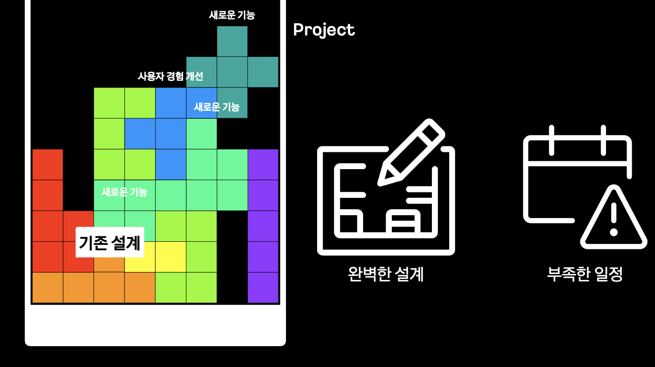 기존의 설계에 맞춰 개발을 진행하다 보면 사용자 경험 개선 작업과 새로운 기능을 추가해야 하는 상황이 생깁니다. 그러다 보면 기존의 설계에서 벗어나 당장에 필요한 기능을 추가해야 하는 일이 발생합니다. 이로 인해 기존의 설계에서 벗어나 개발을 해야하는 상황이 벗어나고 전체 구조가 바뀌게 됩니다.