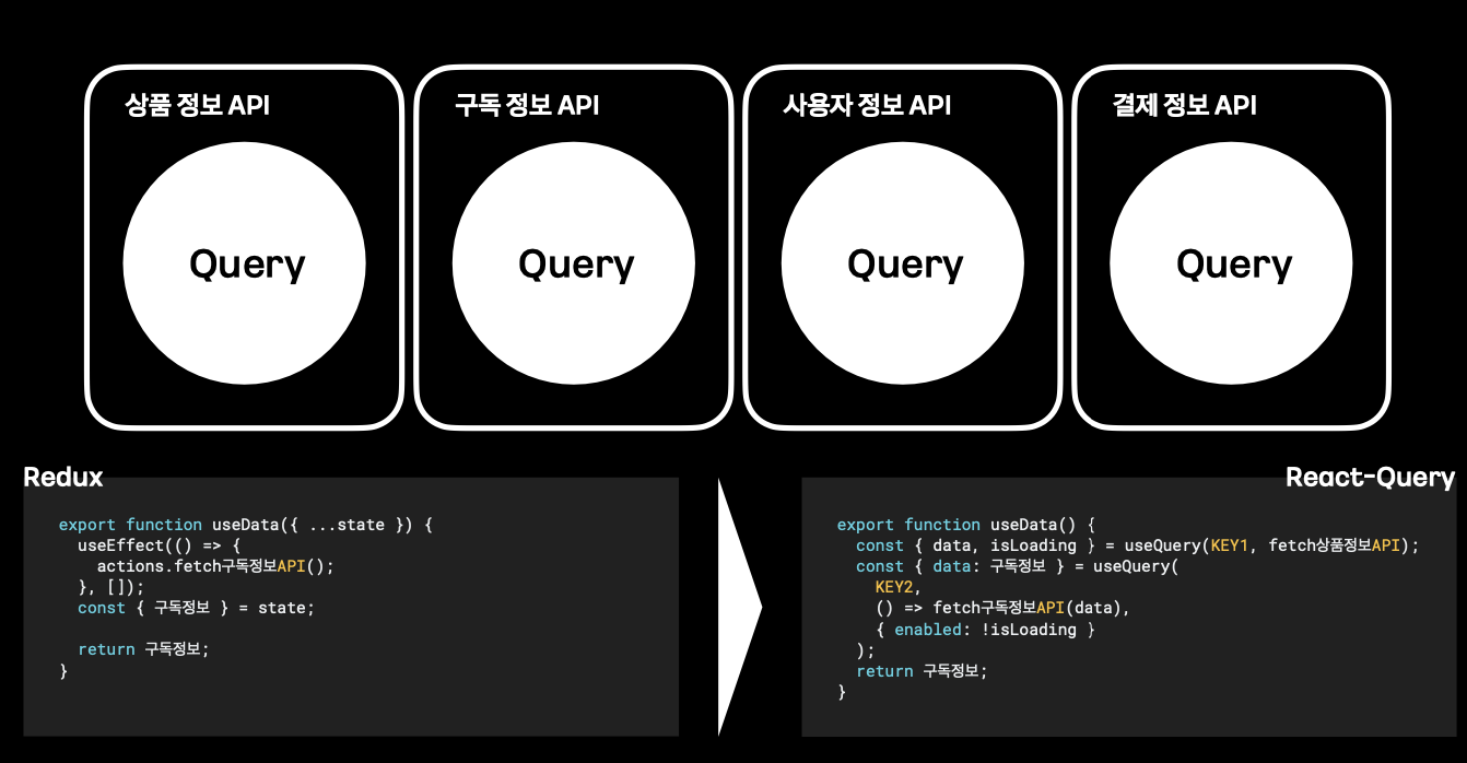 컨퍼런스 발표를 통해 실제 My 구독 팀에서 어떤 방식으로 코드를 변경하여 React-Query로 전환하였는지에 대해 구체적으로 다루고 있습니다. 하지만 이에 대해 하나씩 설명드리는건 불필요하다고 판단하여 설명은 생략하였습니다. My 구독팀의 React-Query로 전환 과정이 궁금하신 분들은 [눈에 보이지 않는 개선: My구독의 Redux에서 React-Query 전환 경험 공유]를 통해 확인해보시면 좋을 거 같습니다.