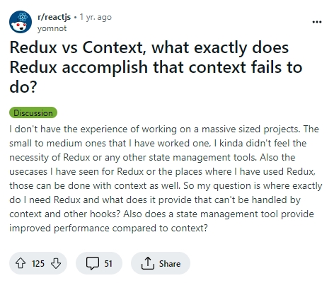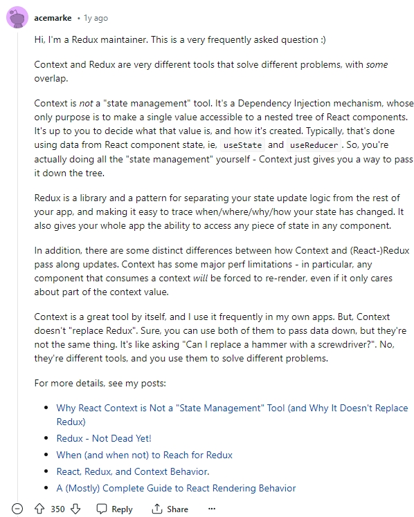 Redux Toolkit와 관련한 레퍼런스를 알아보던 중 흥미로운 Reddit Discussion을 읽었습니다. 의견 작성자는 Redux가 Context API의 어떠한 문제점을 해결해주는지에 대해 발제하였고, 이에 대해 Redux 개발팀의 maintainer가 답변을 달았습니다.