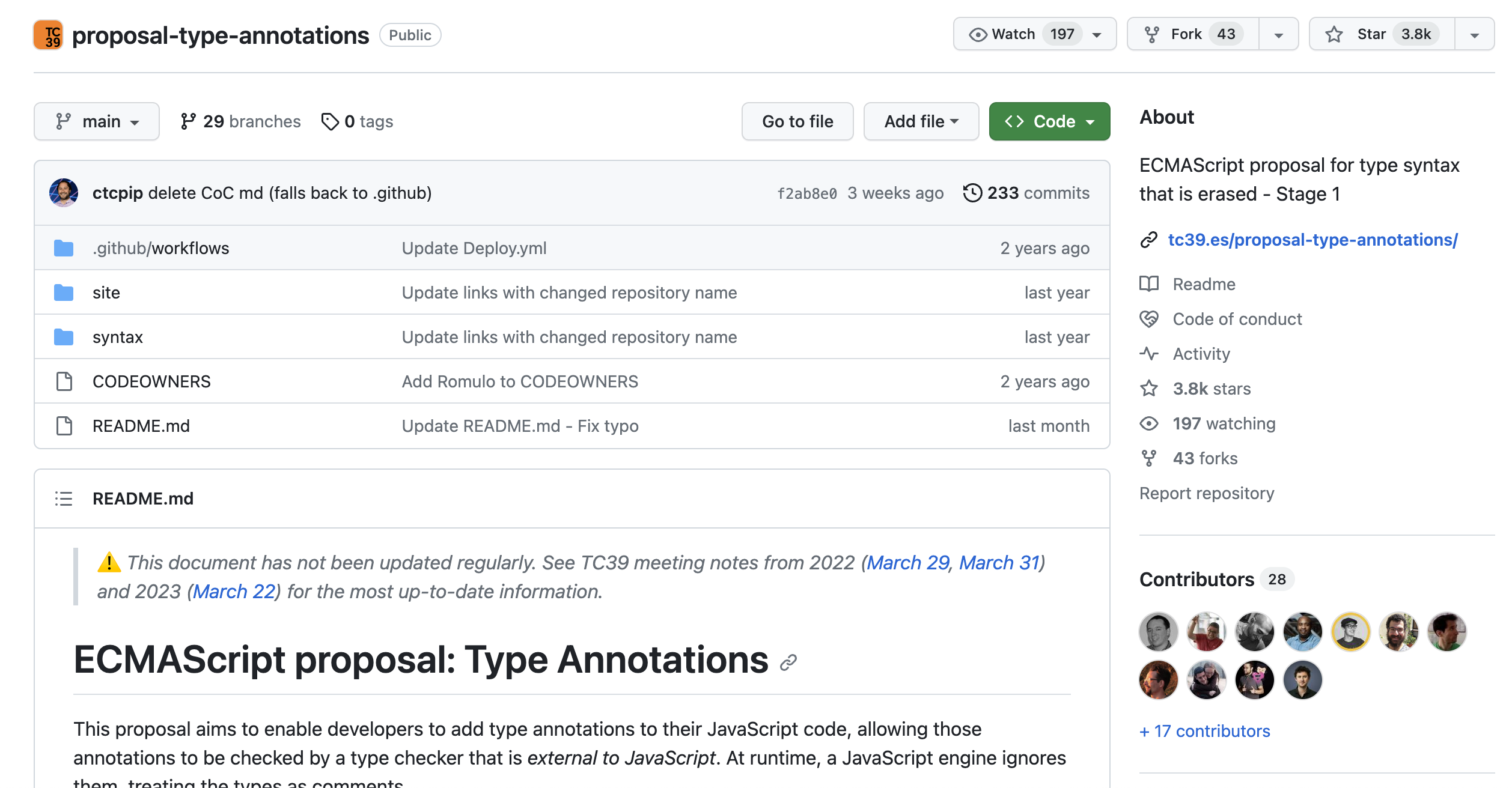 ECMAScript proposal for type syntax that is erased - Stage 1 - GitHub - tc39/proposal-type-annotations: ECMAScript proposal for type syntax that is erased - Stage 1