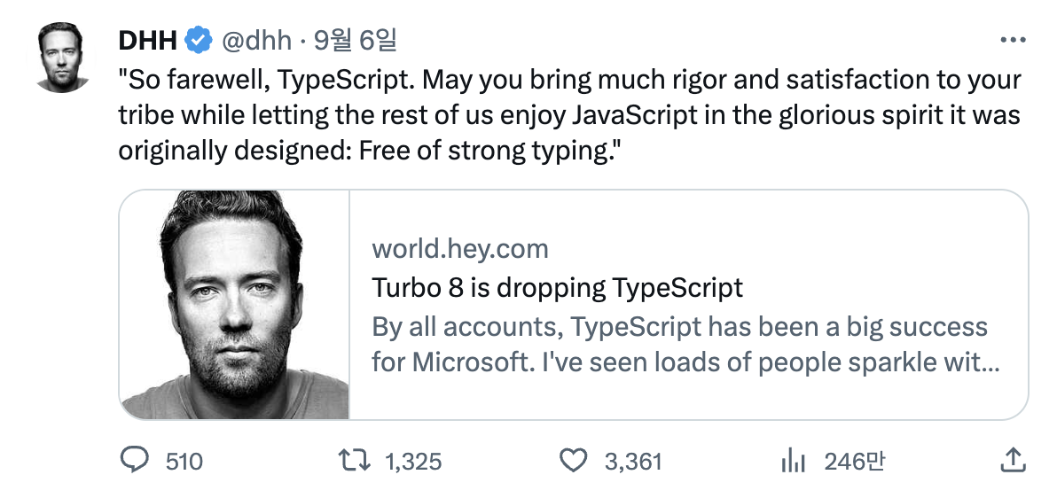 Ruby on Rails의 개발자 데이비드 하이네마이어 핸슨(이하 DHH)의 Turbo 8 is Dropping TypeScript 포스트가 최근 화제를 모으고 있습니다. 최근 Svelte 또한 프레임워크 개발 시 TypeScript를 사용하지 않는 방향으로 전환하기도 해서 더욱 눈길이 가는 소식입니다.
