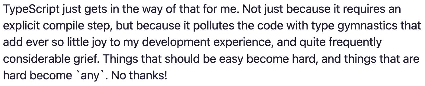 By all accounts, TypeScript has been a big success for Microsoft. I've seen loads of people sparkle with joy from dousing JavaScript with explicit types that can be checked by a compiler. But I've never been a fan. Not after giving it five minutes, not aft