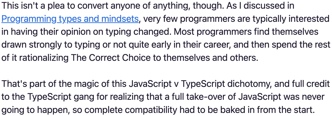 DHH가 밝히길 대부분의 프로그래머들은 자신의 경력 초기에 타입에 강하게 끌리거나 그렇지 않을 것이며, 그 후로는 그들의 ‘올바른 선택’을 합리화하는데 시간을 보낼 것이며 이것이 JavaScript와 TypeScript 이분법을 초래한다고 간주하고 있습니다.
