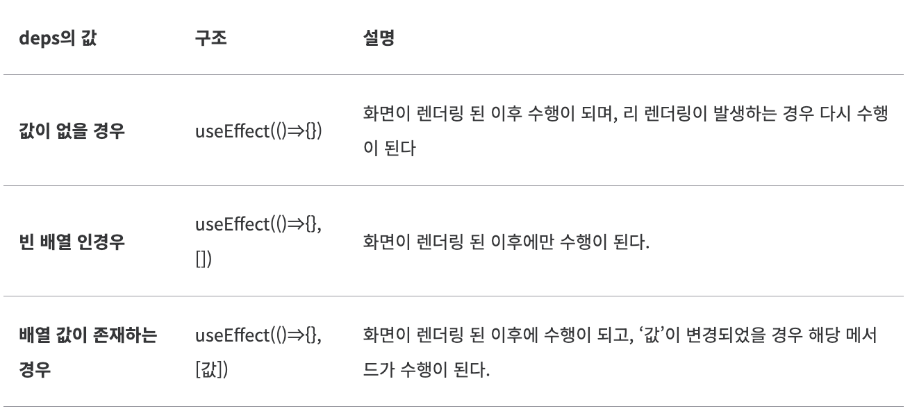 - useEffect는 기본적으로 useEffect(function, deps)의 형태를 가집니다.