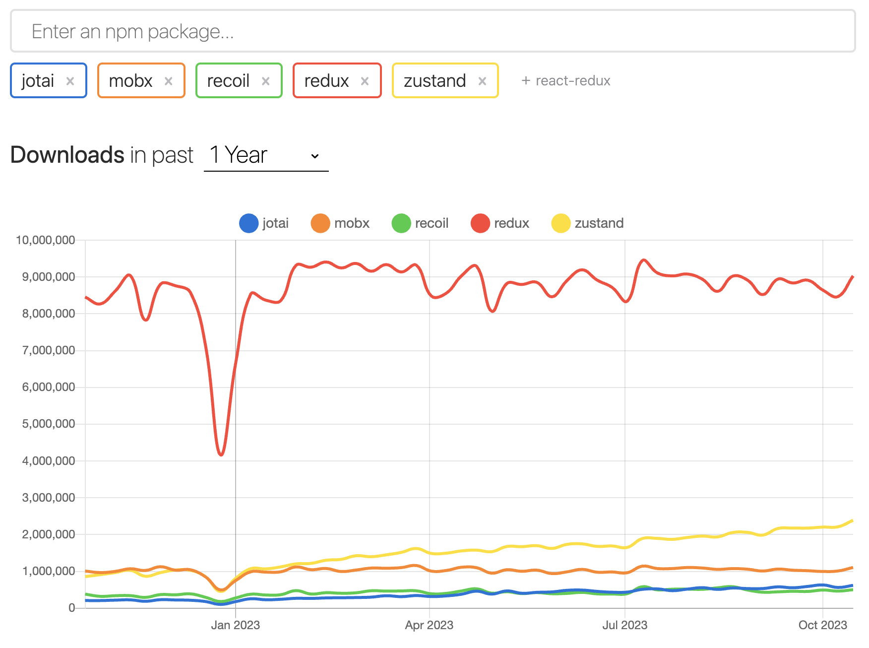 다음은 npm trends를 통해 상태 관리 라이브러리의 이용 추이를 확인해본 이미지입니다.