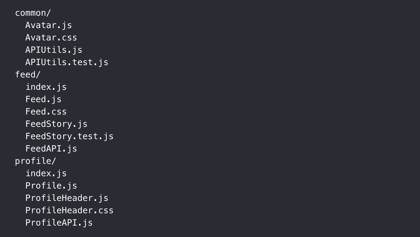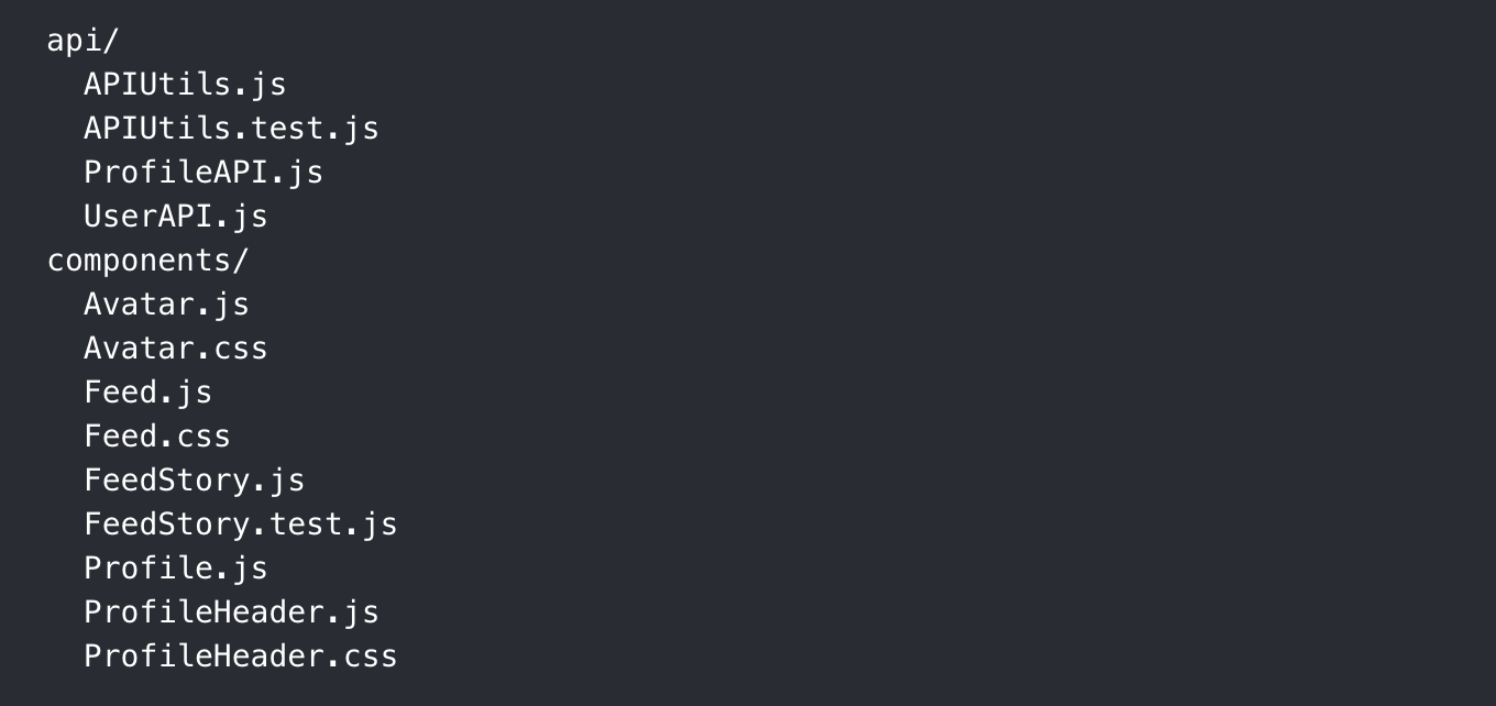 프로젝트를 구조화하는 일반적인 방법 중 하나는 기능 또는 경로 별로 그룹화 된 폴더 내에서 CSS, JS 및 테스트를 함께 찾는 것입니다.